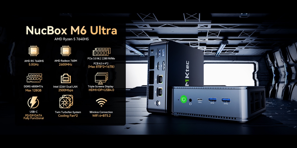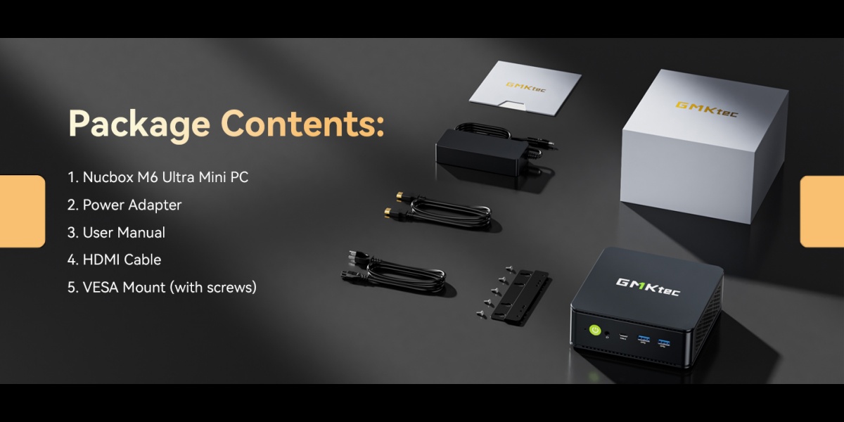 | Memory Expansion | Dual SO-DIMM Slots. Dual Channel MAX. 128GB | Package Contents | 1 x GMKtec Nucbox M6 Ultra Ryzen 5 7640HS Mini PC, 1 x Power Adapter, 1 x VESA Mount with Screws, 1 x HDMI Cable, 1 x User Manual |