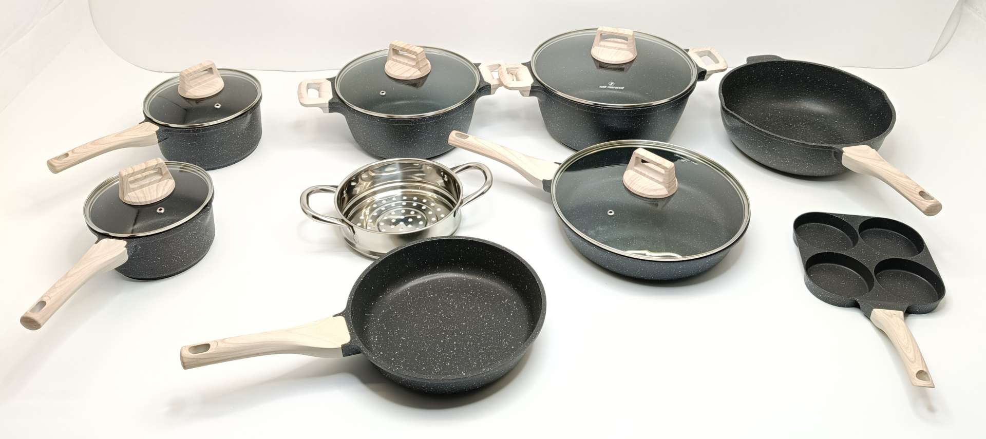 L'ensemble ne comprend pas d'accessoires de cuisine. La poignée de la poêle de 24 cm présente une petite éraflure et le couvercle présente une petite rayure, qui n'affectent pas le fonctionnement du produit.