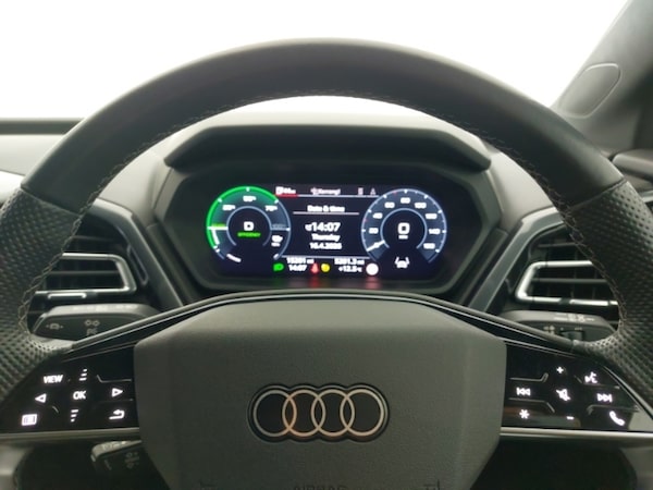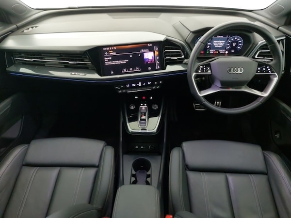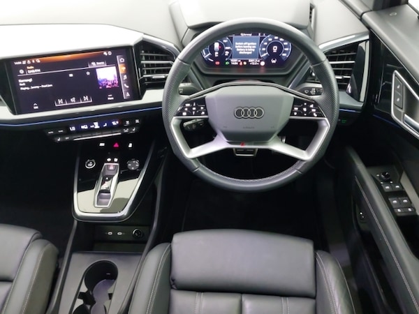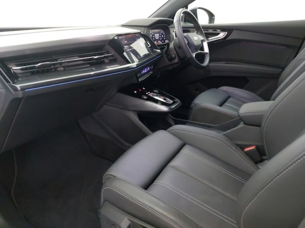 Rear view camera, Audi Virtual Cockpit - 10.25"" display, Apple CarPlay, Android Auto, Adaptive cruise control with speed limiter, MMI Navigation Plus with high resolution 11.6 inch touchscreen colour display, Power operated tailgate with sensor controlled release, Lane departure warning including emergency assist, Camera based traffic sign recognition, Bluetooth interface, Audi drive select, Ambient lighting plus pack - Q4 E-tron, Heated front seats, 2 USB-C ports with charge and data functions, Audi sound system with 8 loudspeakers incl. centre speaker, subwoofer and 6-channel amplifier with total output of 180 watts, DAB Digital radio, Electrically adjustable/heated/folding/auto dimming door mirrors with integrated LED indications + kerb view function for passenger side, Privacy glass - dark-tinted rear window, rear door windows and rear side windows, LED daytime running lights, S line exterior styling, Black cloth headlining, Comfort auxiliary air conditioning, 4 way electric lumbar support for driver and front passenger, 3 zone automatic air conditioning, Keyless Go