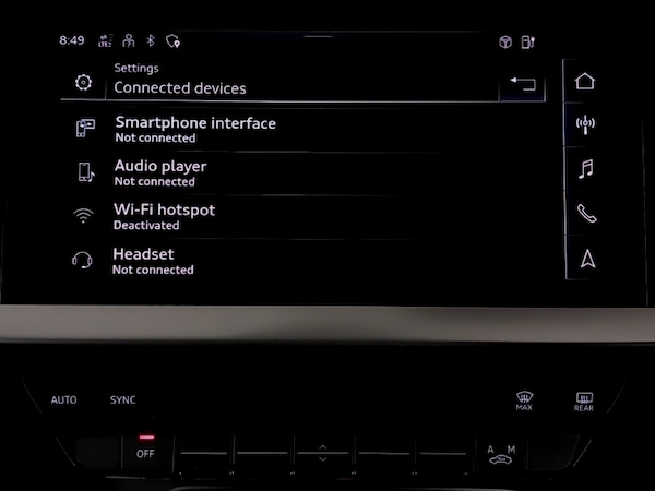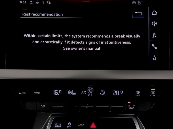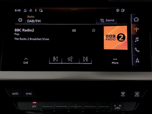 Android Auto, Apple CarPlay, Leather Steering Wheel, LED daytime running lights, LED Headlights, Rain Sensor, Audi drive select (Auto, Comfort, Dynamic, Efficiency and Individual), Audi smartphone interface, Audi Virtual Cockpit - 10.25"" digital and colour instrument cluster, Automatic start/stop system with recuperation, MMI Navigation Plus with high resolution 10.1"" colour touch screen display, 2xUSB-C connection with data and charging functions, 6 passive loudspeakers, Black cloth headlining, Dual zone electronic climate control, Front and rear centre armrest in leather