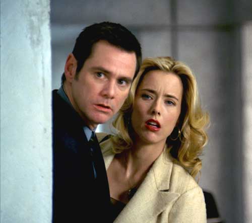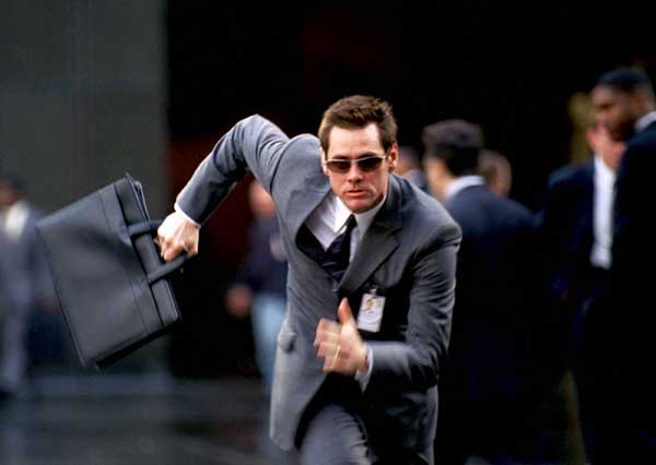 - a very cool press kit holder that has hat looks like a robber's mask with a set of eyes looking through the holes (see pic 1 below). It turns out to be Jim Carrey's face (see pic 2). The same thing is on the back of the box with Tea Leoni's face