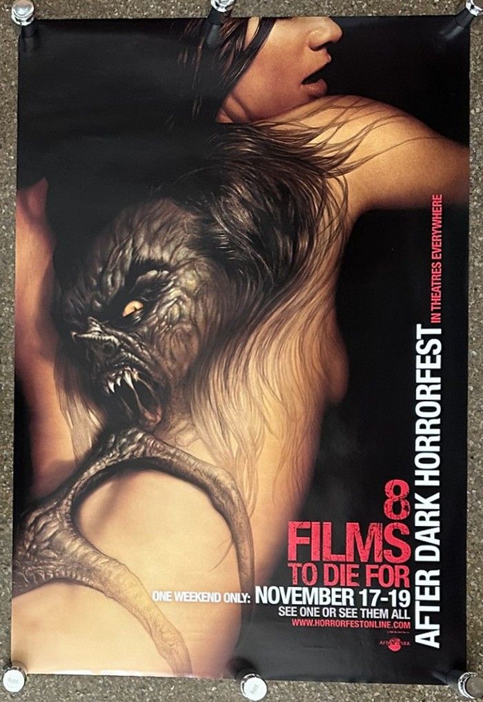 "AFTER DARK HORRORFEST" - 2006 - Original 2-Sided Movie Poster - Style A"8 Films To Die For."Here is a great 2-sided, original 1-sheet movie poster put out to promote the 2006 AFTER DARK HORRORFEST, held Nov. 17-19, 2006. The After Dark Horrofest is a weekend of horror films that are considered too graphic or too disturbing for general audiences. After Dark Films released "8 Films to Die For" (plus one bonus film) for one weekend only in approximately 500 theaters around the United States. After Dark made a few posters to promote the film festival. This is the Style "A" poster. It is a 1-sheet that measures approx. 27 x 40 inches in size. It is rolled and in Near Mint condition. It is an original poster, 2-sided and has been stored in a dry, smoke-free home. Great item for HORROR fans! PAYMENT METHODS: I will accept PAYPAL. PLEASE CHECK OUT MY FEEDBACK!! BUY WITH CONFIDENCE! GOOD LUCK! |