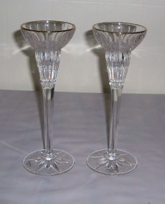 Pair of 2 Mikasa Golden Tiara Pattern 1994 - 2003, Vertical Cuts, Gold Trim, Multisided Stem. Star Cut under Base, Single Candle Holders. Approx 8 5/8" tall, 3" across top. "Hand Wash Only" Stickers in tact. Excellent Condition! No Chips, Cracks. Click here to view my other items! Combined Shipping Always Welcomed! Please email me with any questions prior to bidding |