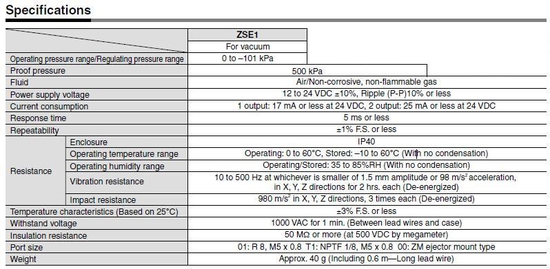 Note: All of the following specifications are for SMC model ZSE1-00-55, though it is believed that it has the same specifications as NZSE1-00-55. It is unknown what the "N" designates. It may simply be an older or newer part number for the same model.