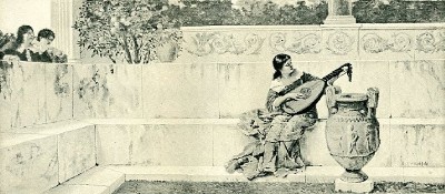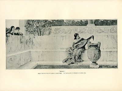 Subject: From the Painting by Edwin H. Blashfield. By Permission of Thomas B. Clarke, Esq. Woman with stringed instrument, scene, phototype, black & white, b&w.