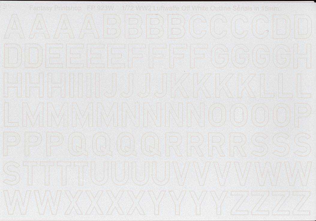 Offered for sale is a set of 1/72-scale decals for German World War II Luftwaffe 15mm Outline Serials in White, made by Fantasy Printshop Decals.
