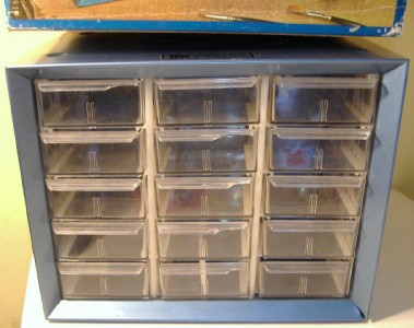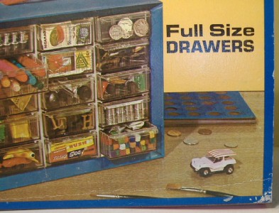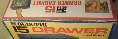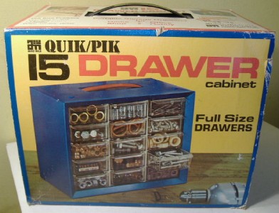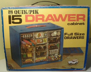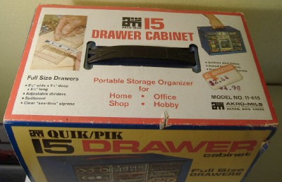 For the TJet collector who thinks they have seen it all yet wants something very cool to store some of their collection in, here up for sale is a used 1971 Akro-Mils 15 drawer storage cabinet for HO slotcars with a photo of an Aurora TJet white dune buggy slotcar on the cardboard sleeve.