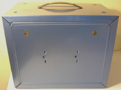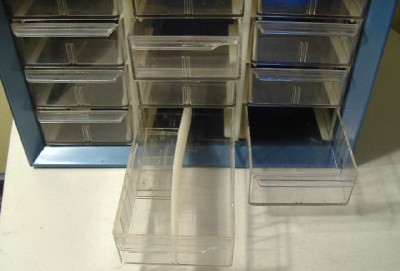 The sleeve shows some wear and has an approximately six inch long tear in the top front corner edge as shown. The ~10 inch wide cabinet is made of steel with a baked blue enamel finish, and has a scratch on one side. The clear plastic storage drawers are each 2.75" wide by a little under 1.25" deep x 5.75" long, and will each hold 4 TJet cars comfortably. Comes with six clear plastic dividers for dividing up cars or parts, and one longer whitish divider. Five of the storage drawers have broken off and missing areas in the front lips as shown. Comes with a plastic carrying handle and the back has two holes for mounting to a wall if desired.