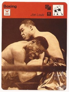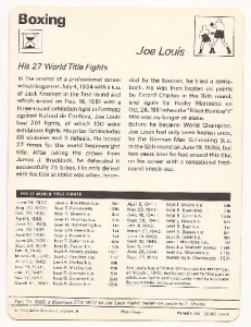 Joe Louis Boxing Card, Edito 1979 Here up for sale is a Joe Louis boxing card made in 1979 by the Edito company from Italy. The "card" is made of heavy paper, much thinner than gum type cards. It measures a little over 6.25" long by 4.75" wide. There is damage on the card in the lower right corner area as shown, where perhaps another card was once stuck to it, and it shows some paper surface tears, white marks, and bending in this area. Back of card has his 27 world title fight history stats, plus other info in text. Nice unusual card for a collector. Check out the items in my ebay store, since you can combine items to save on shipping. Payment is in US dollars by Paypal.