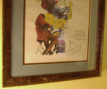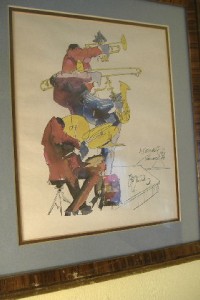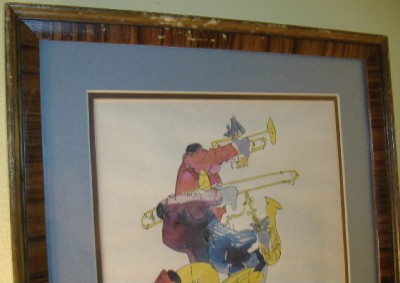 Meiersdorff New Orleans Jazz '76 Watercolor Framed Print Here up for sale is a colorful jazz themed print consisting of a brass section and drummer. Overall dimensions including frame are about 17.5" tall by just under 15" wide. This is apparently a print, not an original piece of art. It is facsimile signed "Meiersdorff, New Orleans 76", where facsimile is meant to mean the signature is part of the print, not an original hand written signature. Paper has some watermarks near the top on the left side. The glass and wooden frame has numerous dents and wear marks in the wood, and is ready to hang. Nice for a fan of jazz or New Orleans. Check out the other items in my ebay store, since you can combine items to save on shipping. Payment is in US dollars by Paypal.