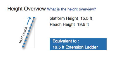Stores at only 3' high, it extends to 15.5' high, and has a 19.5' reach height.