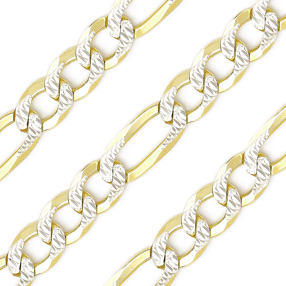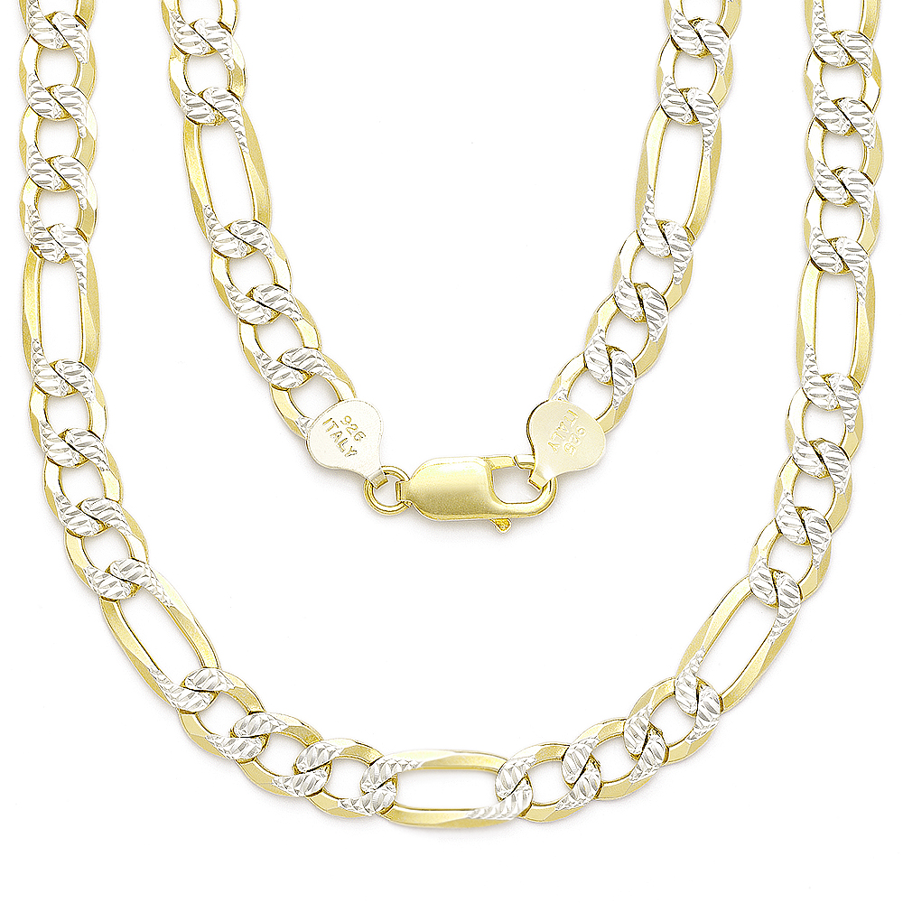 6.8mm Figaro / Figaroa D-Cut Pave Link Italian Chain Necklace in .925 Sterling Silver w/ 14k Yellow Gold