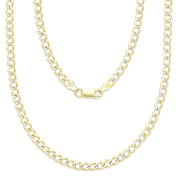 The featured Italian-made 3.9mm curb chain necklace is cast in 14k yellow gold plated .925 sterling silver and showcase links finished on both sides with diamond-cut pave detailing plated with rhodium then finished with a lobster-claw clasp for secure wear.