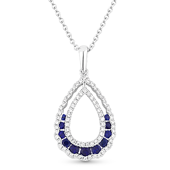 The featured pendant is cast in 14k white gold and showcases a tear-drop design adorned with round cut sapphire gemstones and round cut diamond accents.