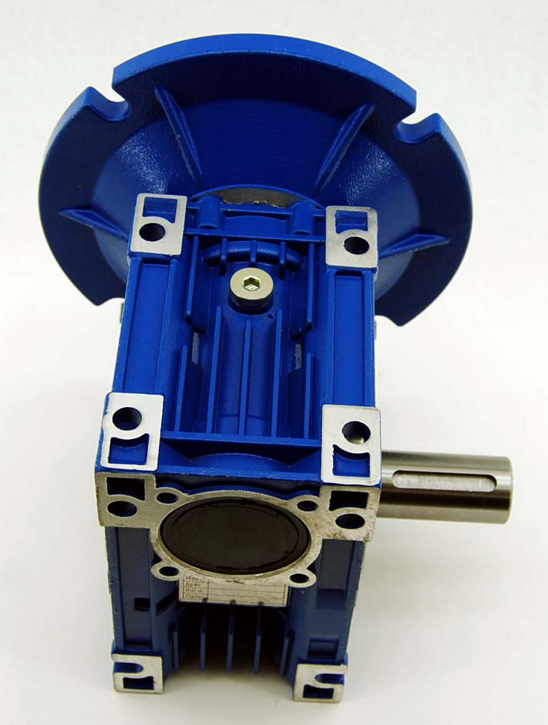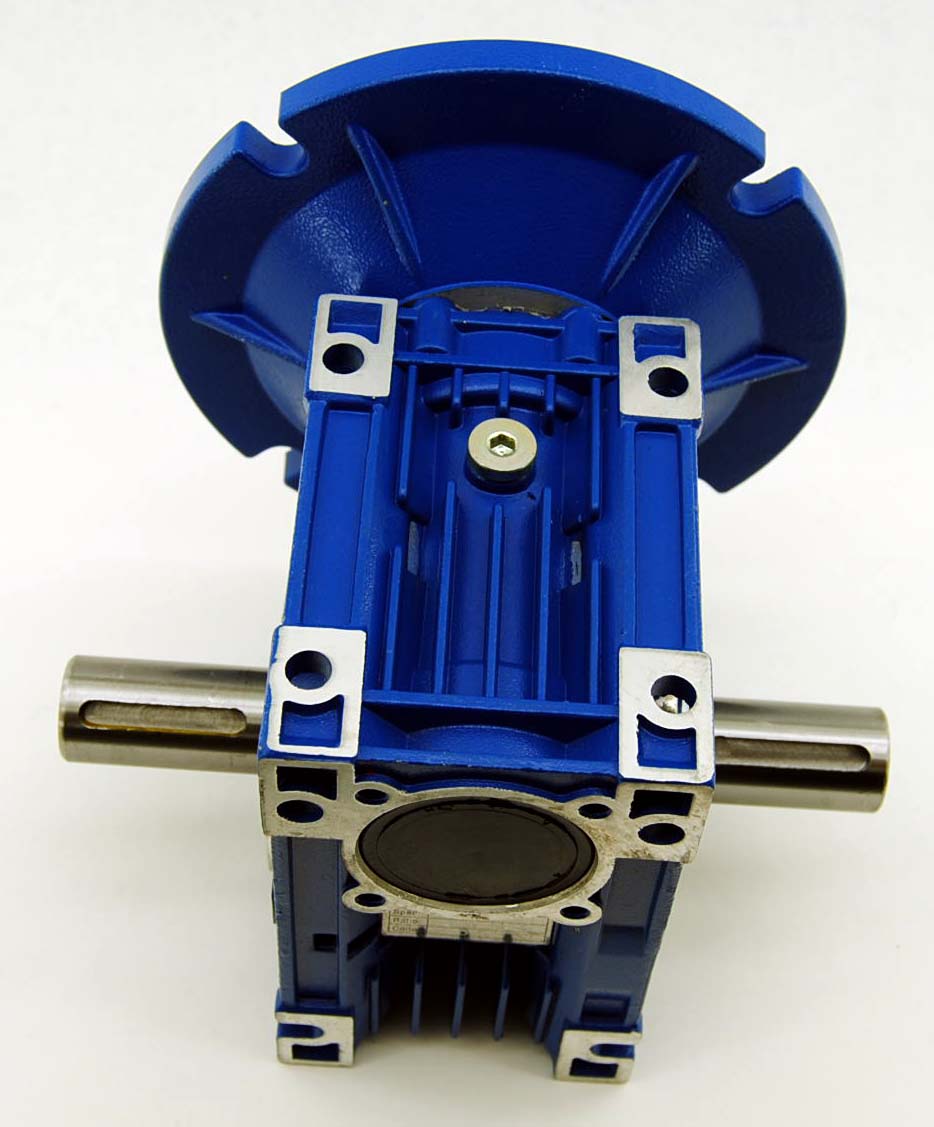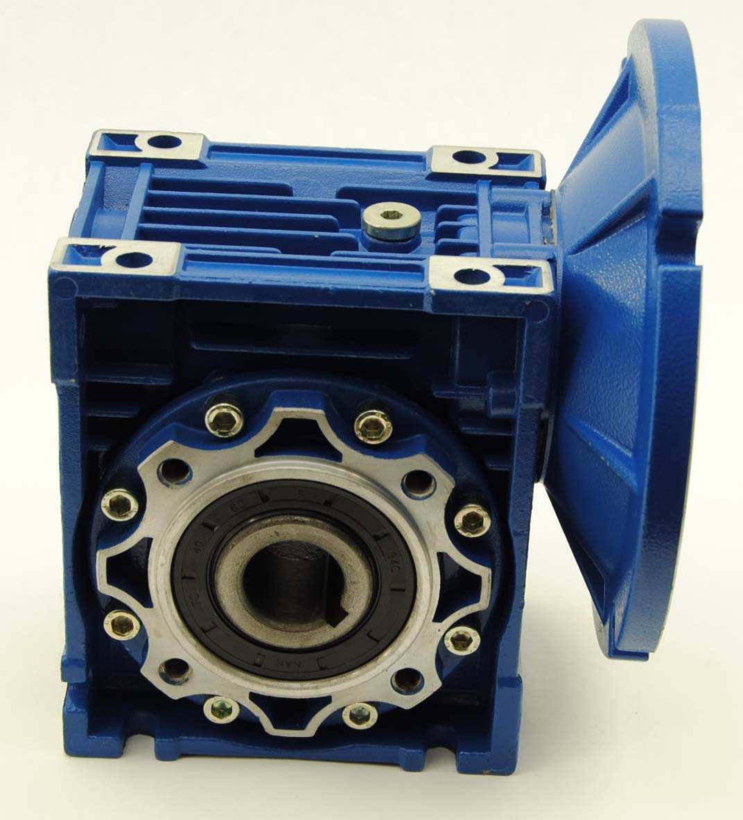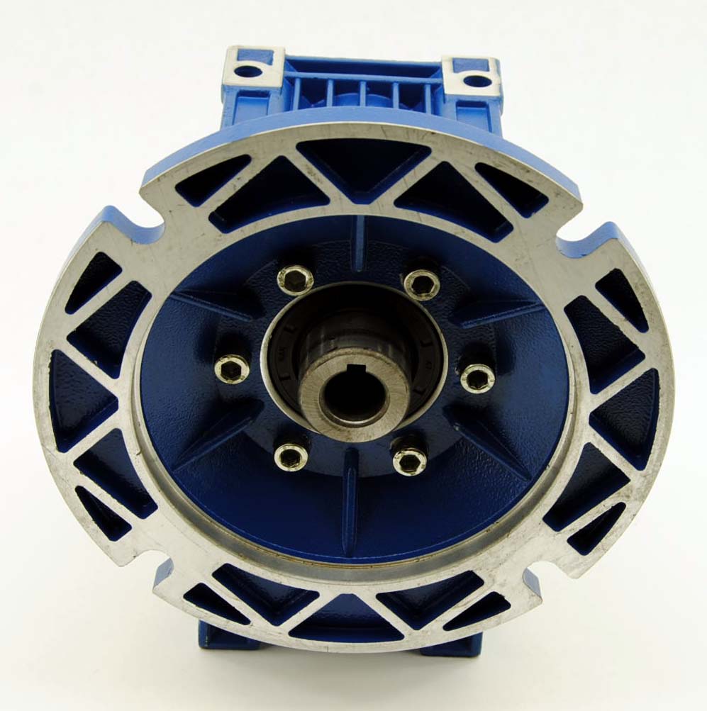 MRV050 series worm gear speed reducer. This 10:1 ratio speed reducer is rated for 2.06 HP input at 1750 RPM on a hollow 5/8" diameter x 1-7/8" long keyed shaft and 56C mounting flange. Output is 637 lb/in on a hollow 1" diameter x 3-5/8" long keyed shaft. High quality reducer has an all aluminum heat sinking designed housing with epoxy coating. You can add a single output shaft (1" x 2" usable) for $19.99 or a double output shaft (2X 1" x 2" usable) for $24.99. Shipping weight: 14 lbs. 7-2-1 |