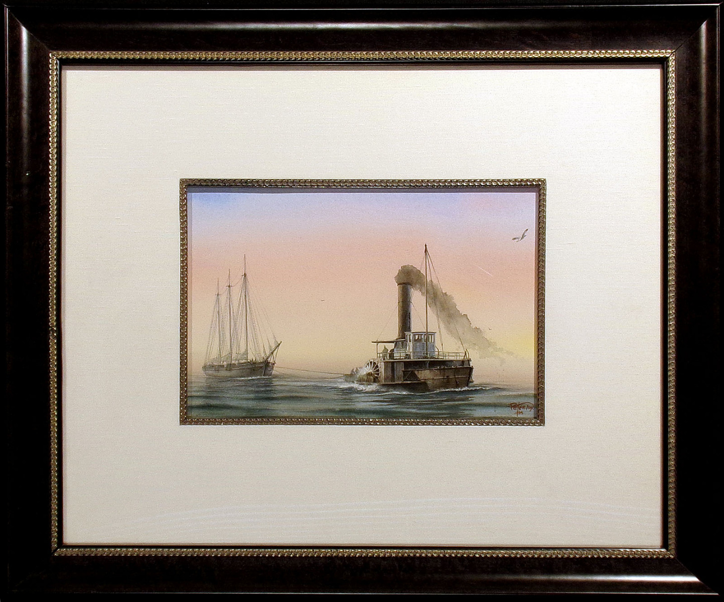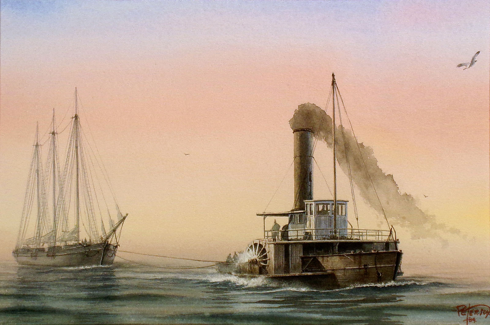 Peterson has been particularly drawn to the transitional time of marine history - 1840 to 1930 - when sails gave way to steam. He admires the grace and romance of the windships and the muscle of the work boats. Though his professional career does include portraiture, figure studies, landscapes, cloudscapes and still life, images of water and wind always prevail.