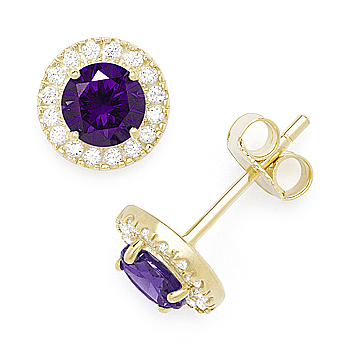 The featured February birthstone earrings showcase halo settings crafted in .925 sterling silver adorned with dark purple round cut cubic zirconia crystals surrounded by clear cz accents. The earrings are then finished with push-back clasps so they can be worn securely on your ears.