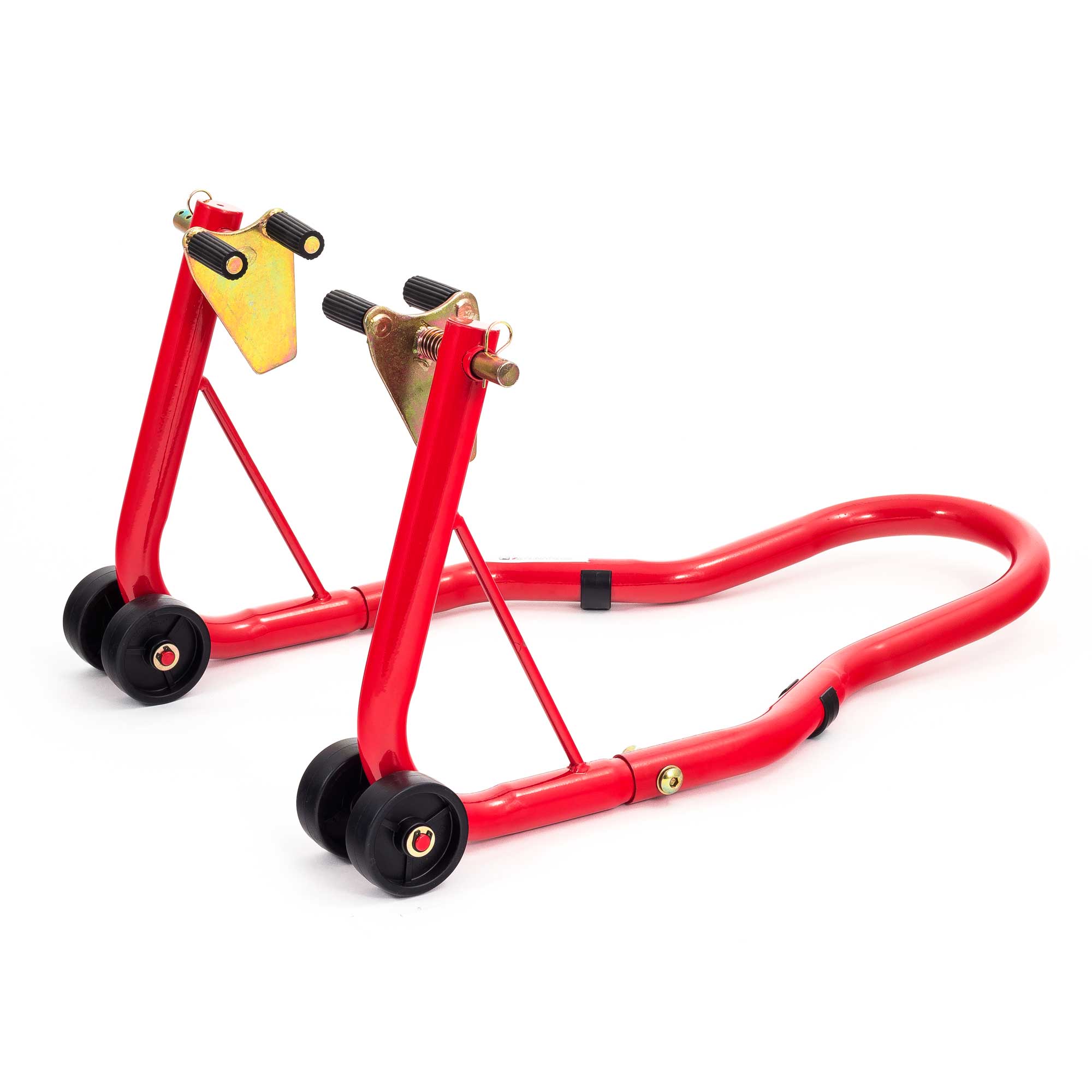 Both with twin wheel designs which provides extra stability when lifting and the broad U-shape footprint offers improved stability while the bike is in the air. Finished in a corrosion resistant red enamel the stand comes supplied with adjustable universal lifting cups allowing for different widths of swing arm - (bobbin hooks sold seperatly).