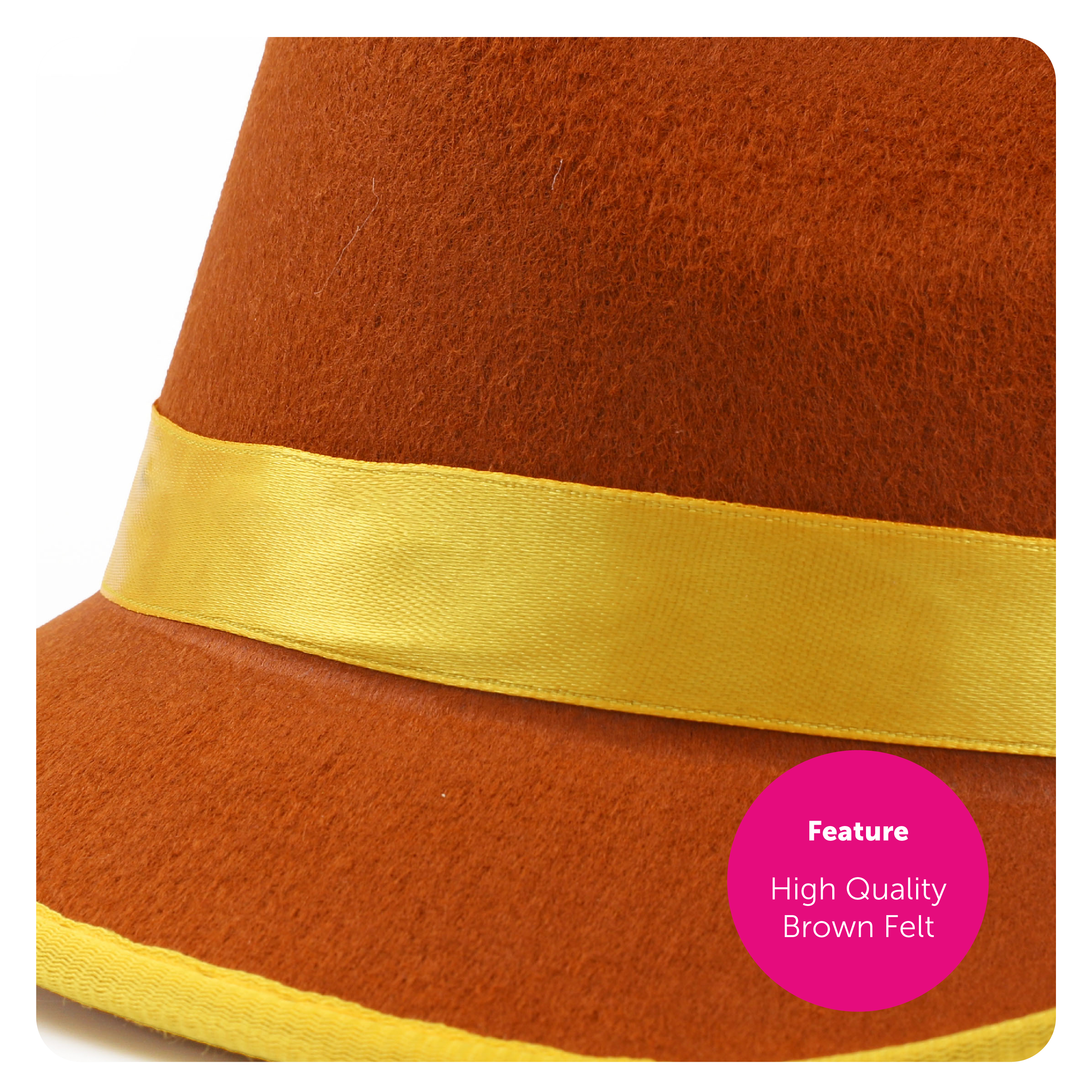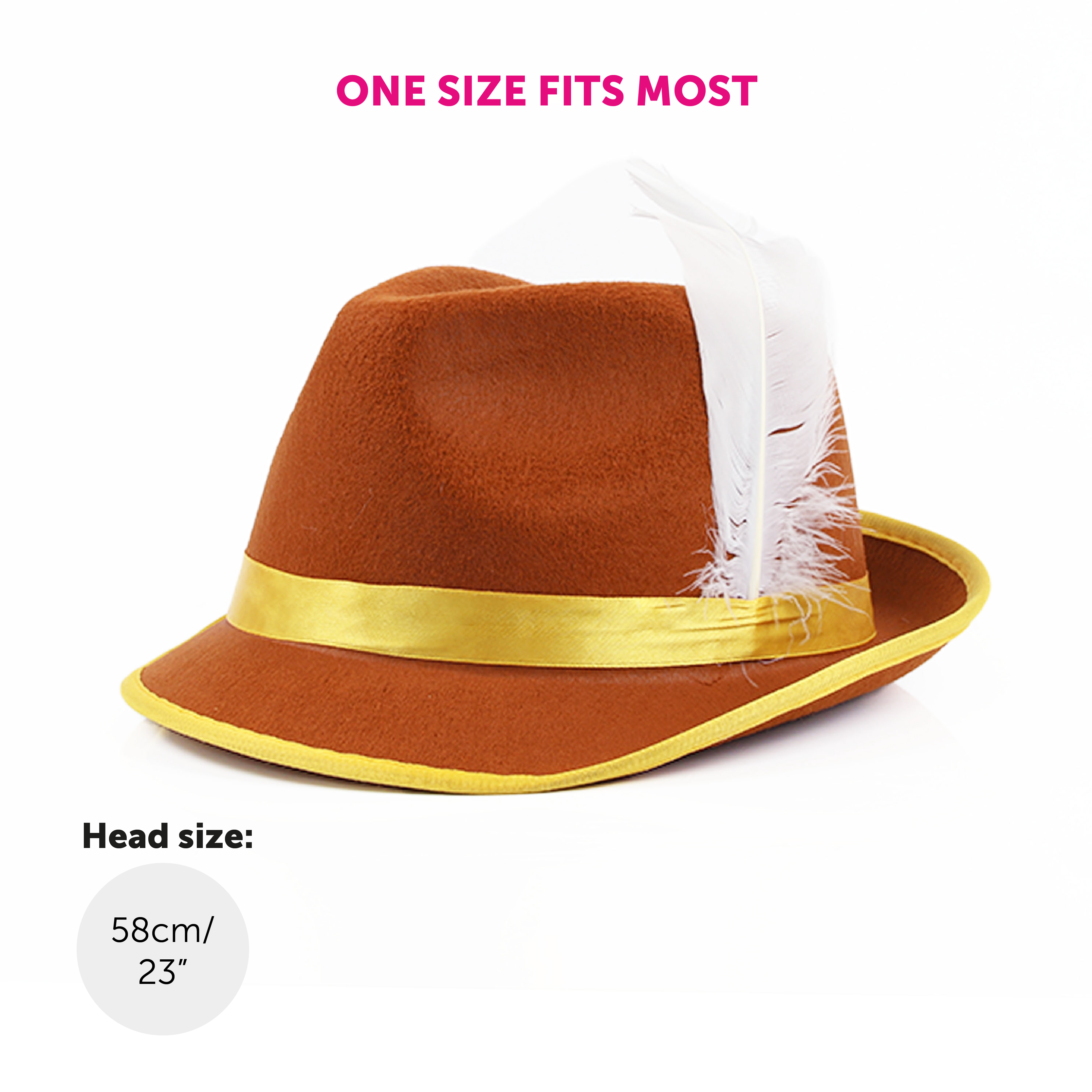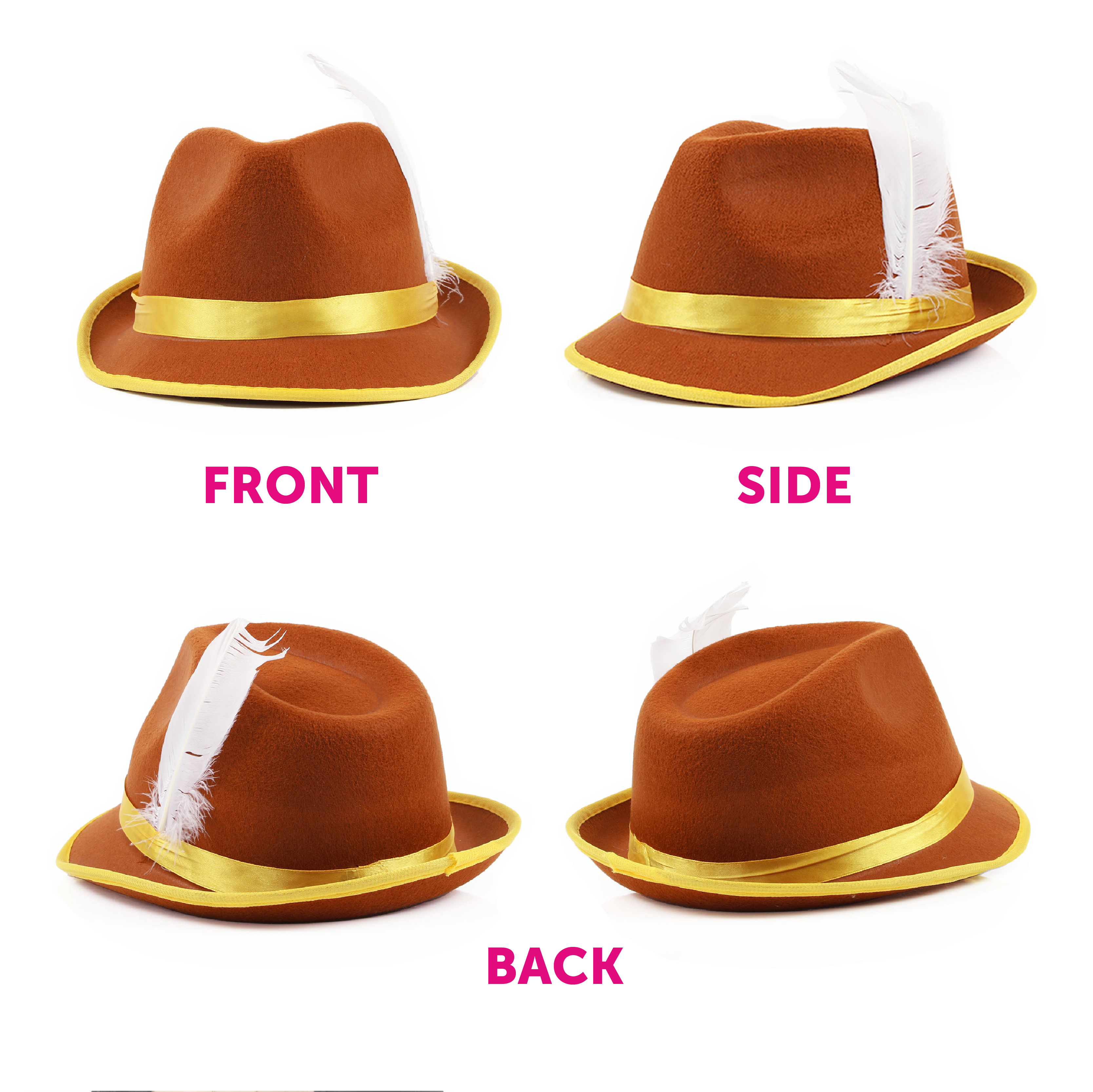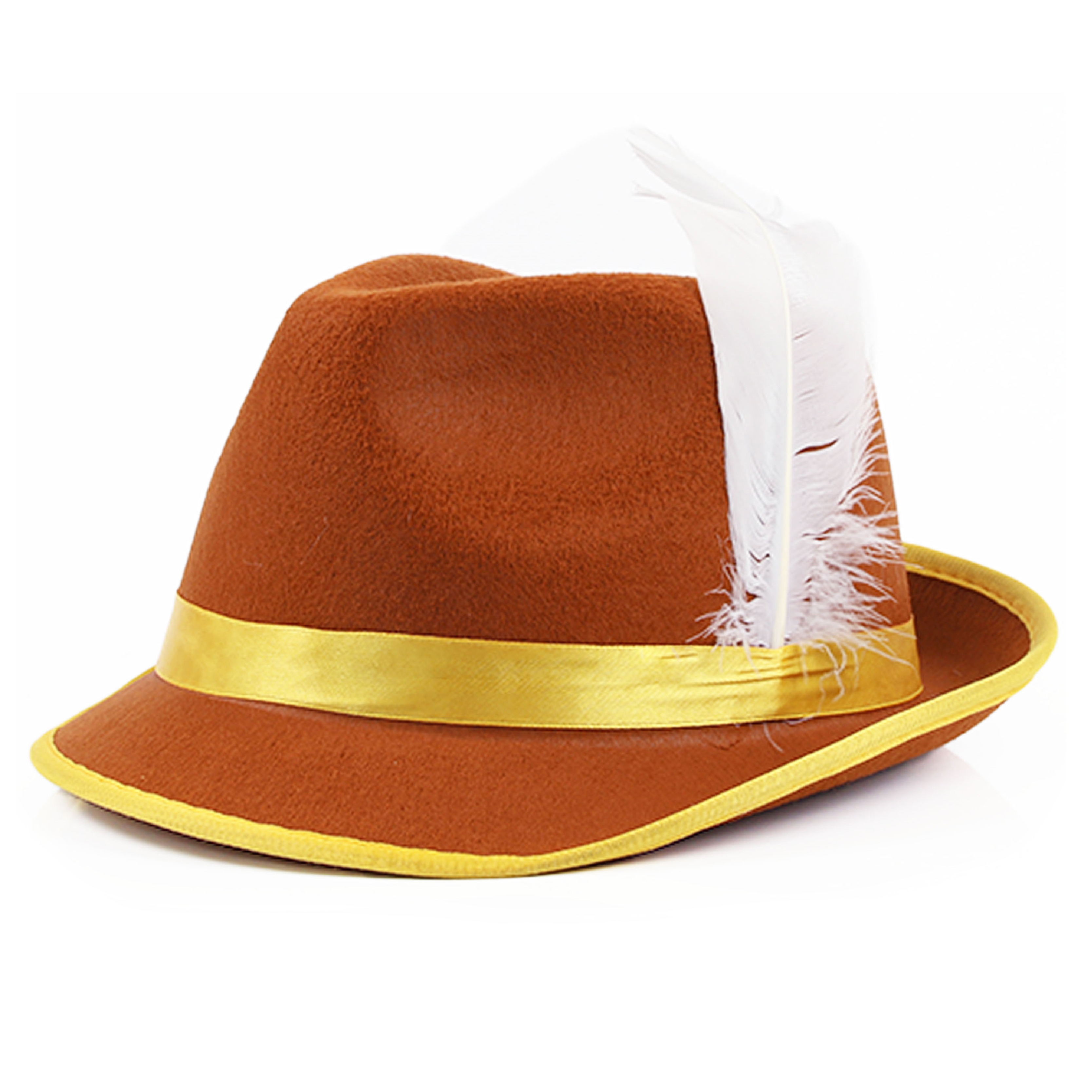 BROWN GERMAN BAVARIAN HAT DETAILS: Your Brown Bavarian Hat is a deluxe high-quality brown felt Oktoberfest hat, with a yellow band/rim on the hats’ crown, and with a white feather detail to complete the look!