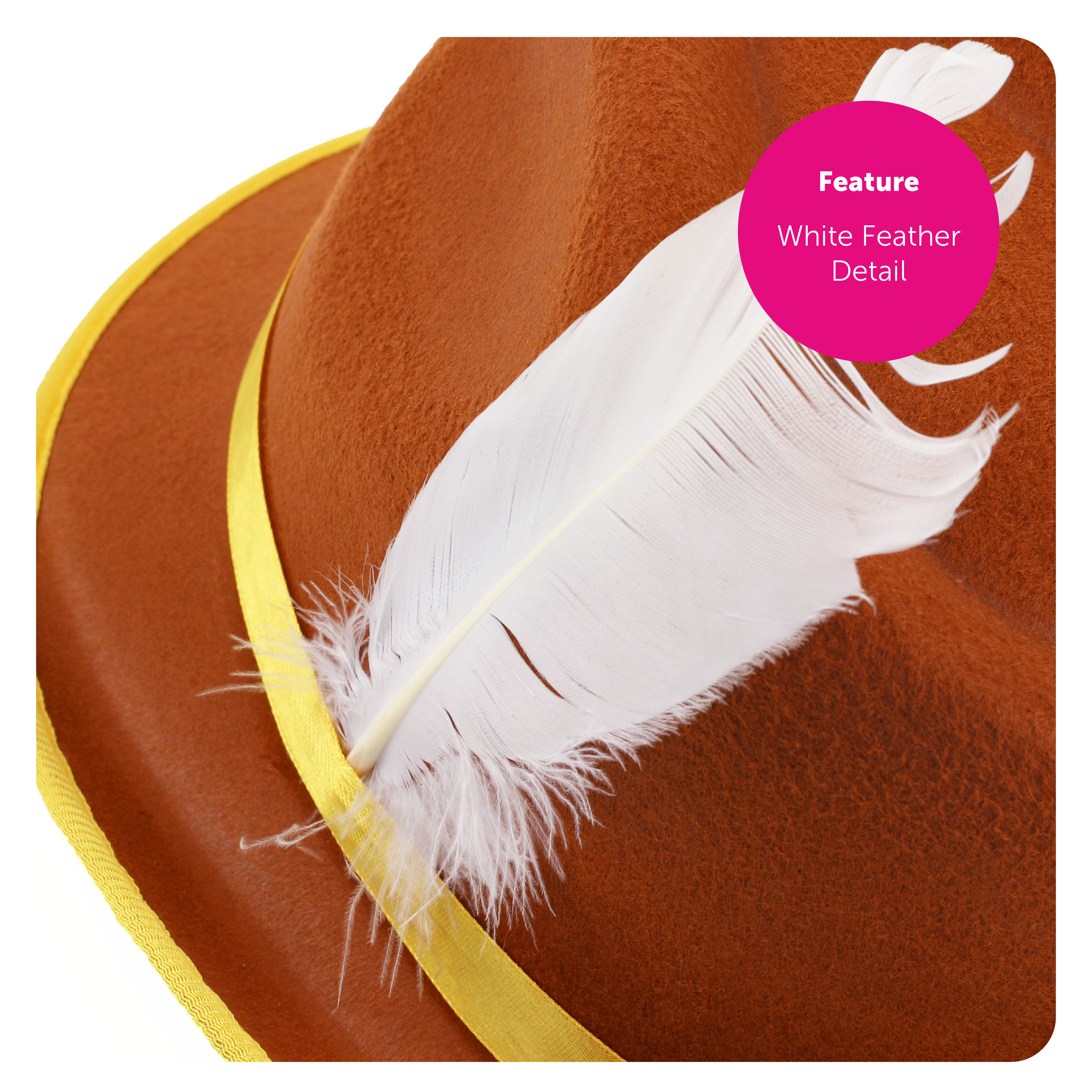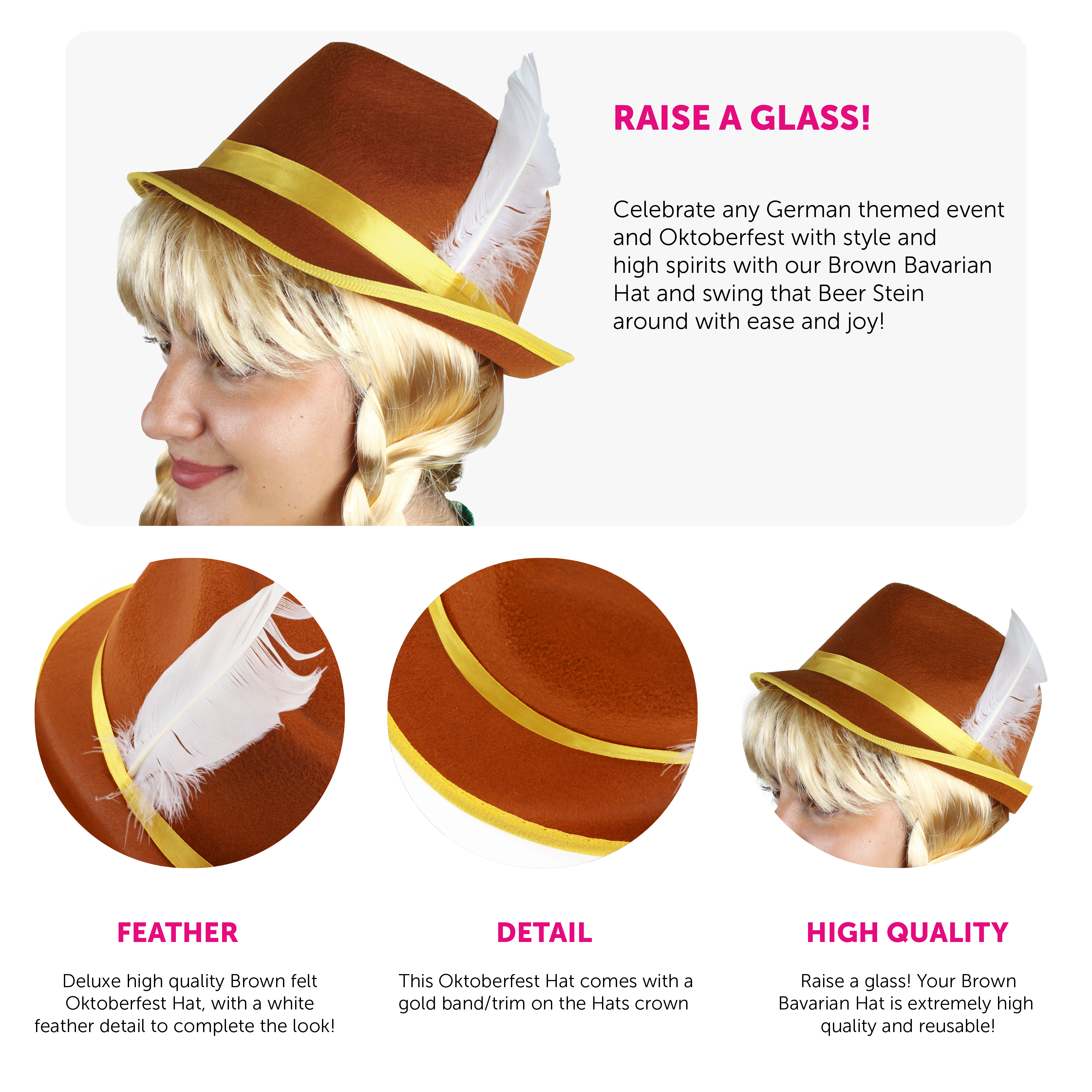 BROWN GERMAN BAVARIAN HAT DETAILS: Your Brown Bavarian Hat is a deluxe high-quality brown felt Oktoberfest hat, with a yellow band/rim on the hats' crown, and with a white feather detail to complete the look!