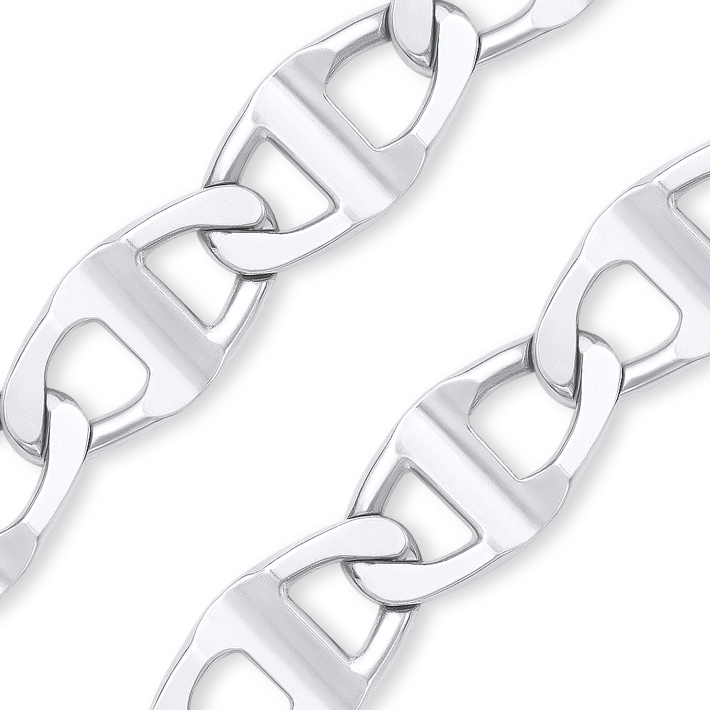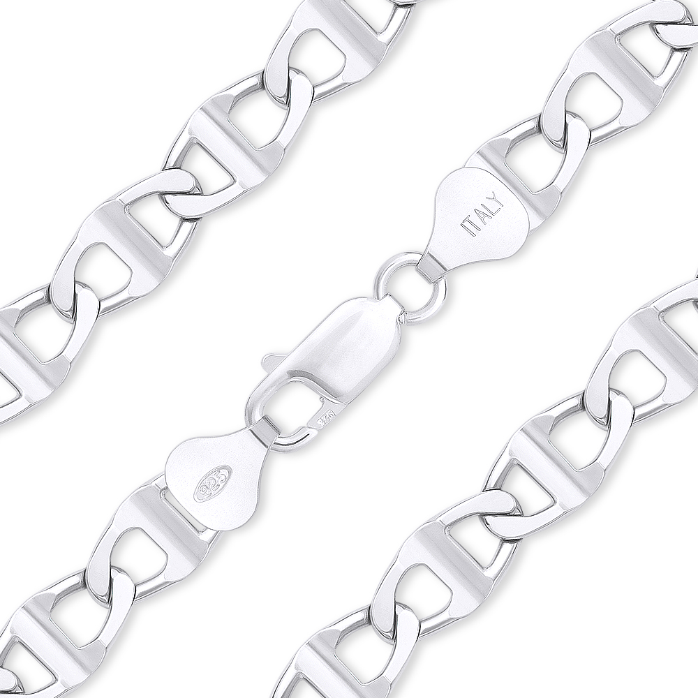 The featured Italian-made chain bracelet is made up of 6.8mm flat squash links cast in solid .925 sterling silver then finished with a lobster clasp for secure wear.