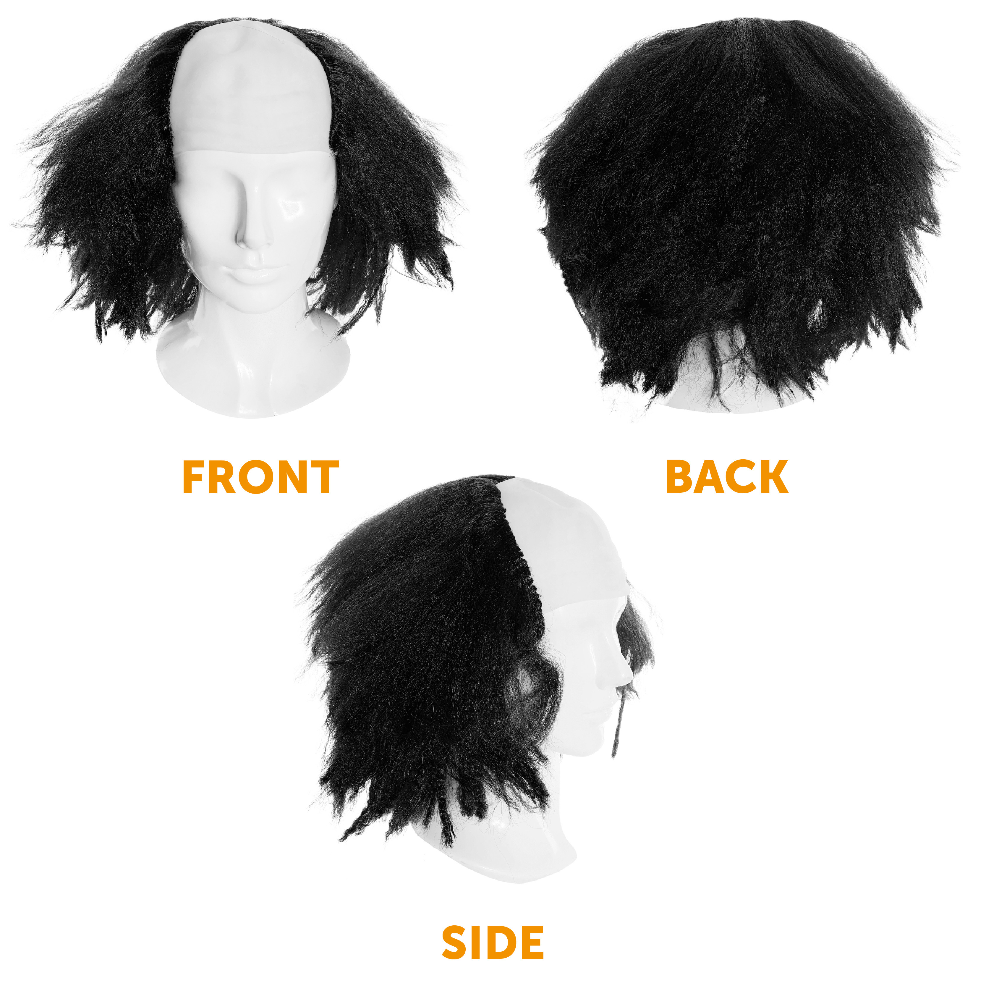 BLACK WIG BALD CAP DETAILS: Your Black Wig Bald Cap is a Bald Cap with crazy Black Hair flared out everywhere, a one size fits all Adults with comfort and ease to get chaotic all day without a problem!
