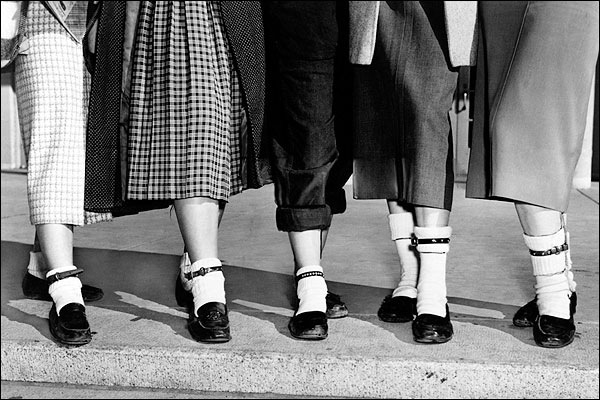 Photo showing legs and feet of five teenage girls wearing dog collar anklets on their socks, a popular fashion trend at the time.