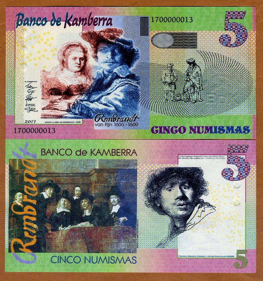 approximately 23,800 inhabitants. It was created by renown French graphic artist Mr. Frank Medina on 24th August 1988. All banknotes are designed and crafted by Mr. Medina himself and are copyright protected. Each banknote has its own unique serial number. All banknotes are limited issues and are retired after a brief period of issue. Each banknote has UV sensitive security strip and various other security features.