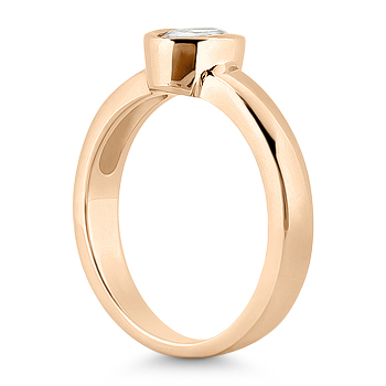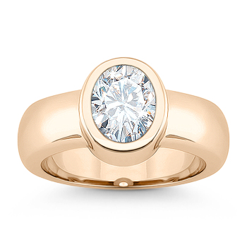 The featured solitaire ring is cast in 14k rose gold and showcases an oval brilliant moissanite gem from Charles & Colvard's Forever Classic Collection set on a full bezel setting.