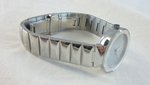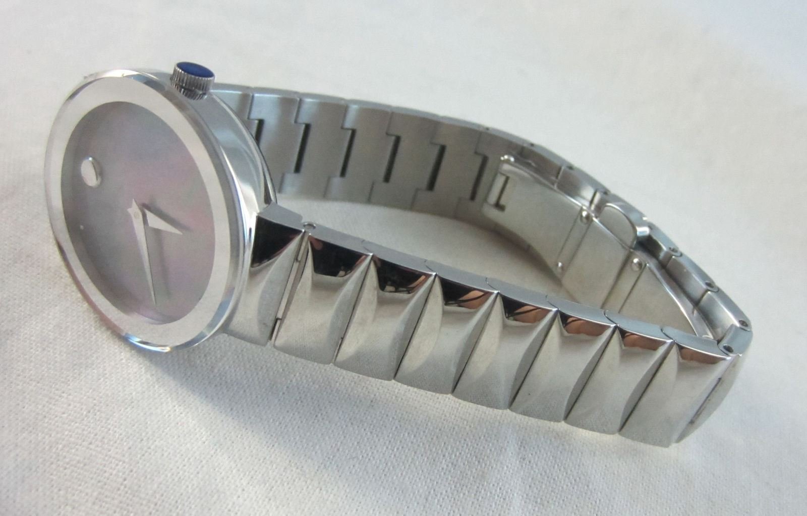 Museum dial with matching dot and hands, stainless steel jewelry-style
