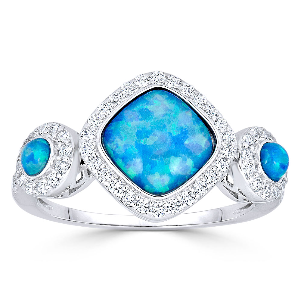 The featured ring is cast in .925 sterling silver and showcases a 3-stone design made up of round & square cabochon synthetic opals accentuated by round cut cz crystals around the opals & on both sides of the ring.