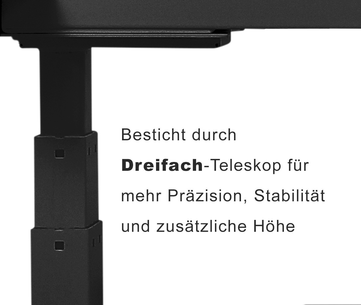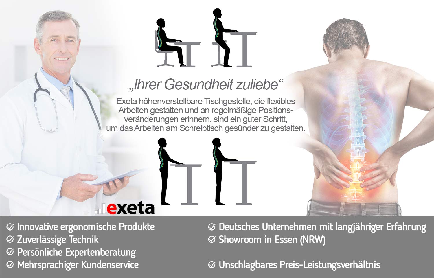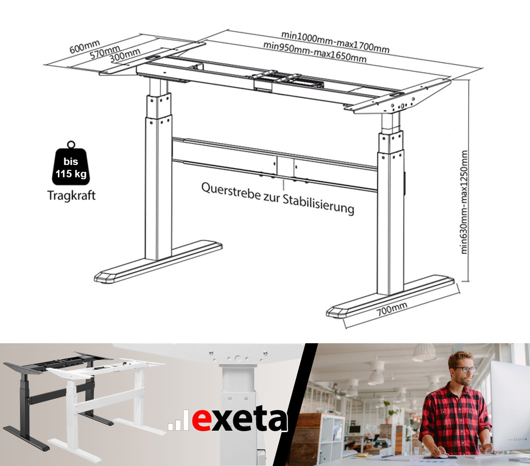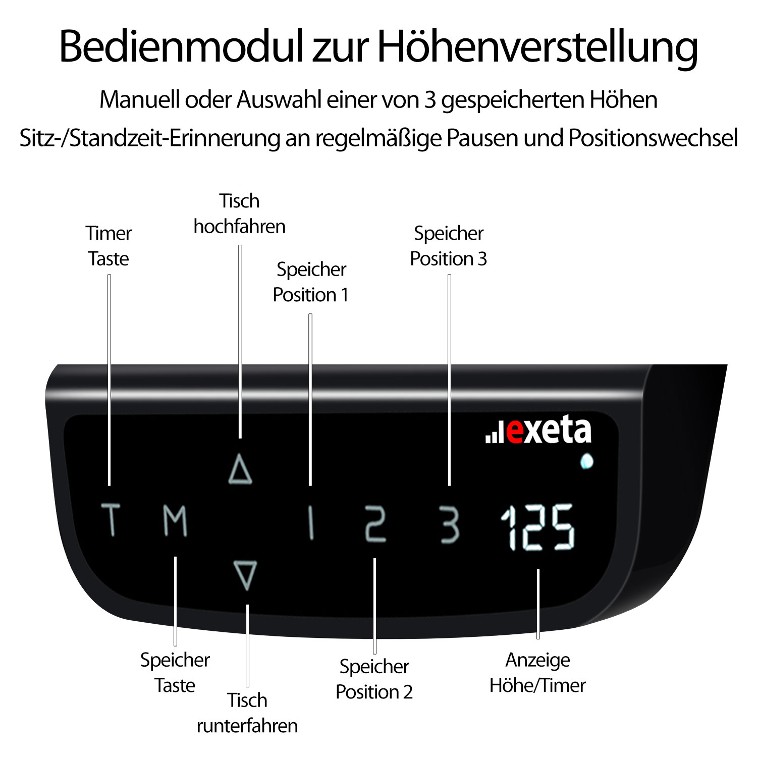 Gute Gründe für das höhenverstellbare Tischgestell Exeta ergroPRO: Ein regelmäßiger Haltungswechsel beugt Verspannungen vor (sitzen, aufstehen). Vorteile: u.a. höhere Muskelaktivität in den Beinen, nachweislich höhere Gehirnaktivität im Stehen, Entlastung des Rückens. Perfekt geeignet für Homeoffice oder Büro. Unsere Exeta ergoPro elektrisch höhenverstellbaren (63 bis 125cm) Tischgestelle bieten Ihnen dank 2er Motoren, eine flüssige und sichere Höhenverstellbarkeit. Die Breite der Tischgestelle ist manuell verstellbar (100 bis 170cm). Der Digitale LED-Speichercontroller mit Touch-Funktion und digitaler Höhenanzeige ermöglicht bequem, die optimalen Einstellungen zu finden! 3 verschiedene Höheneinstellungen können mithilfe der Memory-Funktion dauerhaft gespeichert werden.