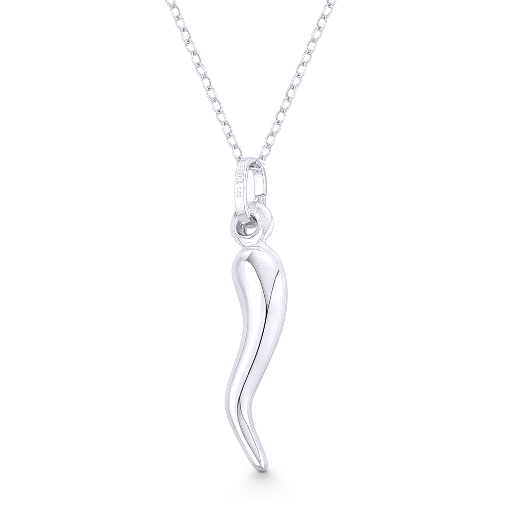 The featured pendant is cast in .925 sterling silver and showcases an Italian horn finished with a sturdy bail that can accommodate most chain sizes.
