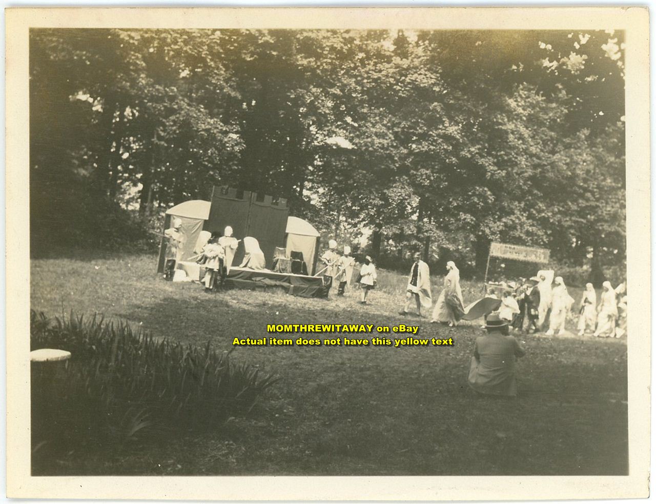 DESCRIPTION: Vintage original photograph, circa 1927 or later, not sure, from the Orchard School in Indianapolis, Indiana, shows little children in costumes, perhaps this is for May Day, stage built to look like a castle, outdoor play.