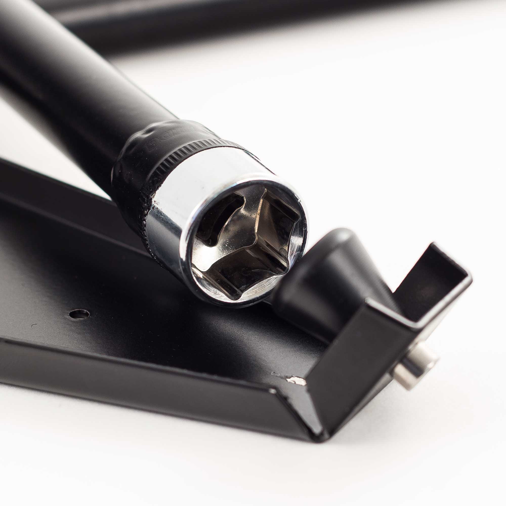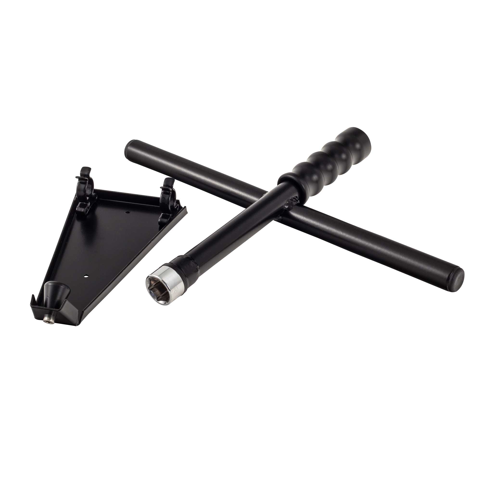 This 19mm wheel brace and mounting plate offer a compact solution to carrying an essential piece of equipment. Powder coated, the triangular mounting bracket comes with 2 pre-drilled mounting holes. The brace, again powder coated is held securely by first locating the socket end onto the bracket and then pushing down the brace onto the 2 spring clips. The handle grip spins freely to aid faster wheel nut removal.