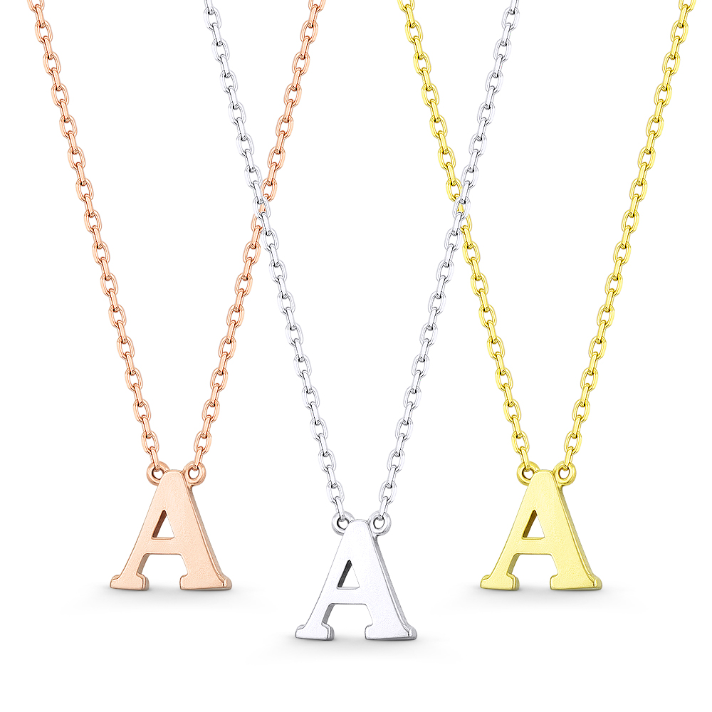 Small Initial Letter "A" Pendant & Chain Necklace in Solid 14k Rose, White, & Yellow Gold