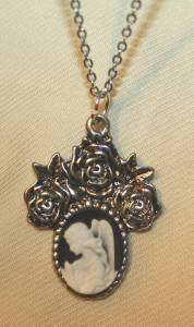 This lovely silvertone necklace has a cluster of sculpted rosebuds at the top that give it a lovely charm and character. It is accented with a black and white resin cameo presenting a praying angel. It measures 1 inch wide and 1 3/8 inches long. The chain is 18 inches and closes with a safety catch. It is in new condition.