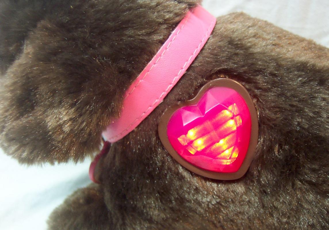 | This is a Barbie LIGHT UP PUPPY DOG WITH SOUNDS Plush Stuffed Animal. Made by Mattel in 2008. It is 5 1/2 inches tall and 12 inches long from nose to tail. It is in Great Condition. Pretend to pet it on the back and top of head, and the heart lights up, and it makes lots of dog noises. Barking, panting, eating, etc. CUTE and SOFT! Clean, no tears, stains or defects. Combine auctions to save on shipping. Please contact me if you need to make other payment arrangements.
