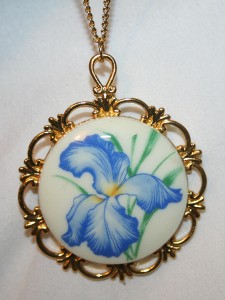 This goldtone necklace features a lovely mid-sized pendant with a swirled outer rim with an inner spoked design. The center is accented with a cream acrylic inset with a blue and green orchid iris flower. The reverse has a plain shiny finish. It measures 1 3/4 inches wide and 2 1/4 inches long with a substantial weight and quality. The chain is 24 inches and closes with a safety catch. It is in new condition.