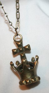 This brasstone necklace features a handsome mid-sized sculpted crown and cross pendant with wonderful depth and detail! It symbolizes Christ the risen Lord - The Christus Victor. It measures 1 inch wide and 1 1/2 inches long. The chain is 22 inches and closes with a safety catch. It is in new condition.