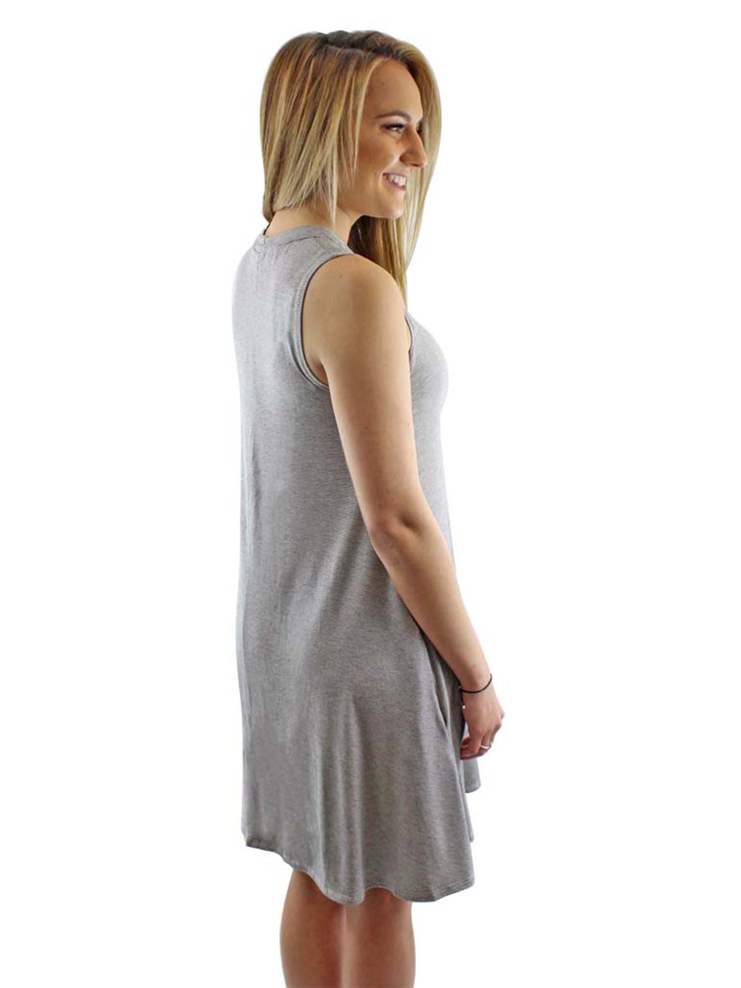 This dress features convenient side pockets.