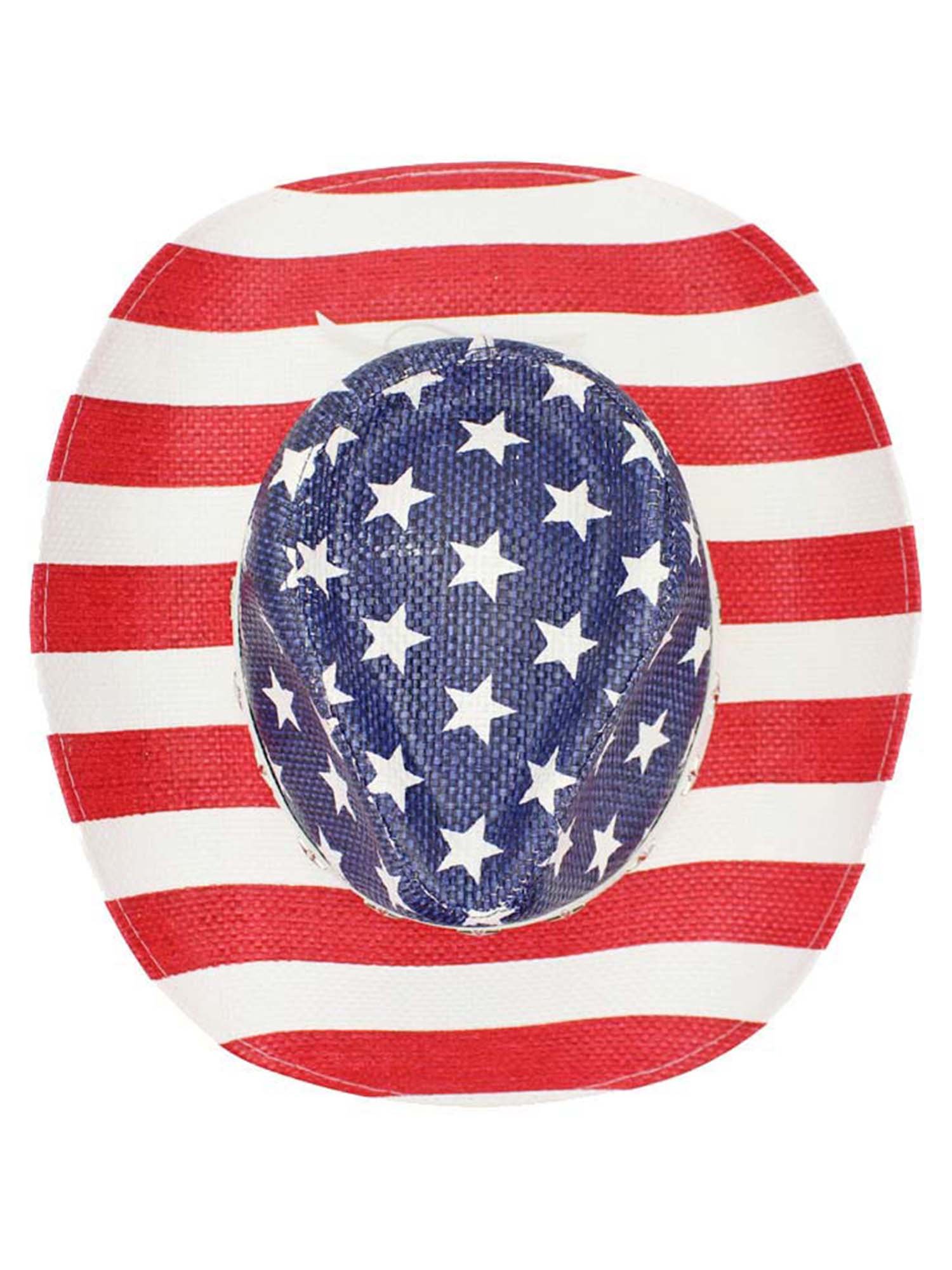 This cowboy hat is shaped from breathable straw making it rigid and sturdy in design, finished off with American flag print.