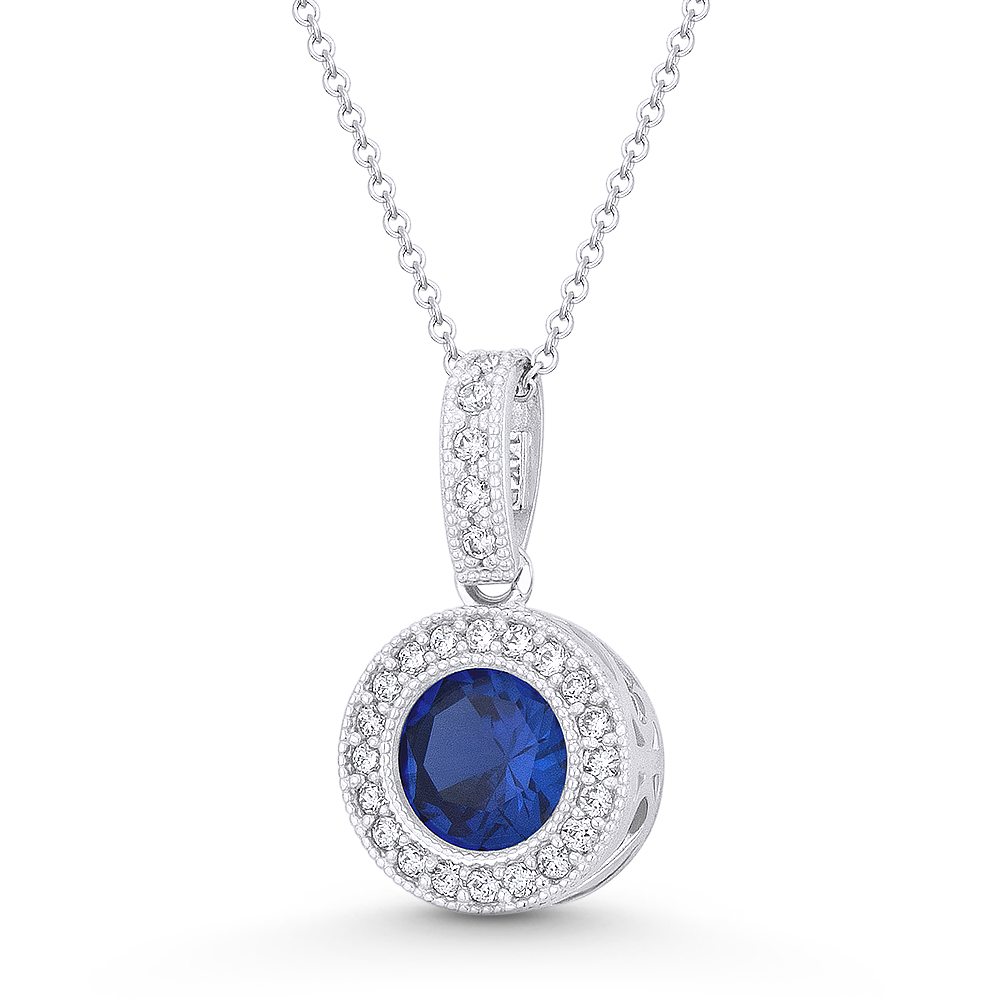 The featured pendant is cast in 14k white gold and showcases a 9mm halo design adorned w/ a 6mm round brilliant cut blue cubic zirconia surrounded by round cut clear cz crystal accents. The halo is then finished with a sturdy bail set w/ cz crystals and can come optional with a thin cable chain necklace.