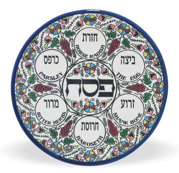 This colorfully designed ceramic plate provides places for parsley, horse radish, an egg, a shank bone, bitter herbs and haroseth - six of the traditional foods that are blessed on during the reading of the Passover Seder.