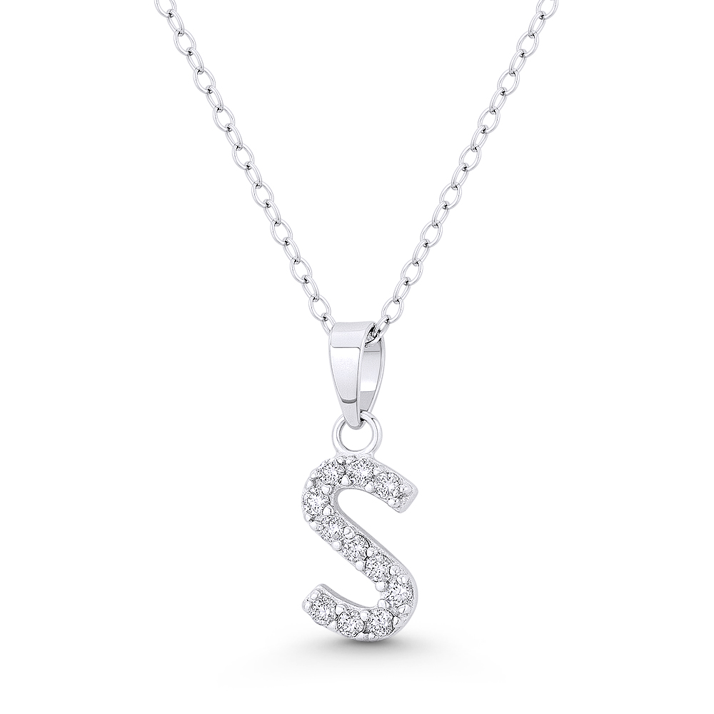 The featured pendant is cast in rhodium-plated .925 sterling silver and showcases an initial letter "S" charm paved w/ cubic zirconia crystals. The initial charm is then finished with a sturdy bail and includes a matching 18-inch cable chain w/ a spring-ring clasp for secure wear.