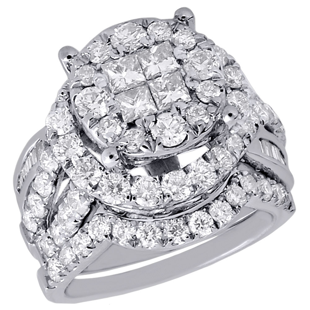 Up for sale is a very affordable priced genuine diamond bridal set. This bridal is set in real 14K White Gold. This set has real round, baguette, & princess cut diamonds in prong & invisible setting. Diamonds are set close together for a uniform and clean look. The diamonds are machine set precisely to give it a clean finish. This engagement ring has a matching engagement band that wraps around the engagement ring perfectly. Center is complimented by round cut diamonds on the engagement ring and the band that compliments the engagement ring.