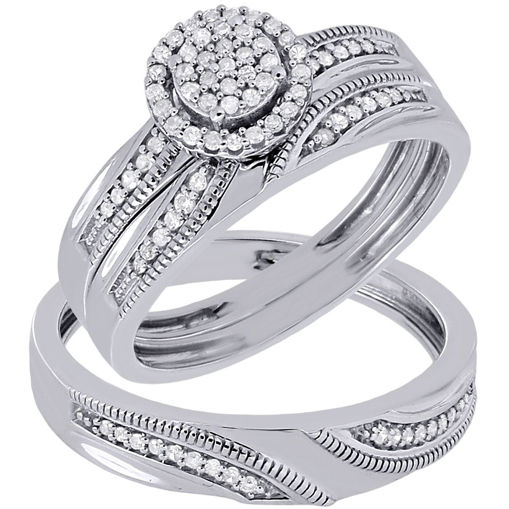 (5.9 grams of .925 Sterling Silver | 0.25 total carats of white diamonds | 6 mm ladies band width | 4.5 mm men's band width | I1 - I2 Clarity | H - I color | Natural Diamond Ladies & Mens Matching Wedding and Engagement Ring Trio Set)