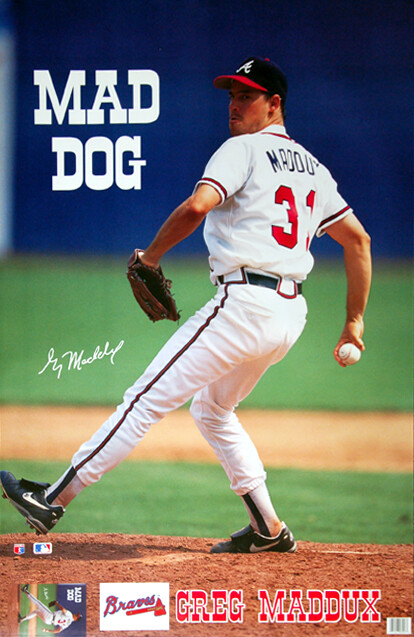 A Greg Maddux classic, from his first season in Atlanta! This spectacular poster features a beautiful shot of the 300 game winner in the prime of his Hall of Fame career, looking great in one of his first Braves starts at the old Fulton County Coliseum. Topped off with the bold "Mad Dog" title, and a facsimile autograph from Maddux himself right on the print, this is both a beautiful commemorative piece for your wall, and a rare collector's item for years to come. A brilliant poster from a long-lost warehouse find, this one was published in the final year in the life of publisher Marketcom Inc., and consequently found its way into very few retail stores before the company was liquidated. Only a few remain in our warehouse; grab yours now while you still can!