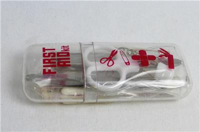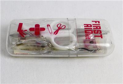 This compact first aid kit has just what you need for minor bumps and bruises. It's compact size easily fits into a pocket, purse, backpack, diaper bag or glove compartment and makes a great stocking stuffer. Reusable hard plastic case contains 2 adhesive bandages, 5 cotton swabs, 1 3# safety pins, 2 0# safety pins, 1 pair of tweezers, 1 mini scissors, and 1 multi-functional knife. Now you can fix and go!