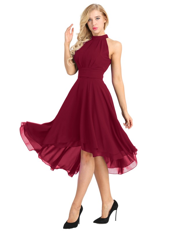 Halter neck and sleeveless, hi-lo design, back zipper closure with clasp, pleated decoration on the waist.